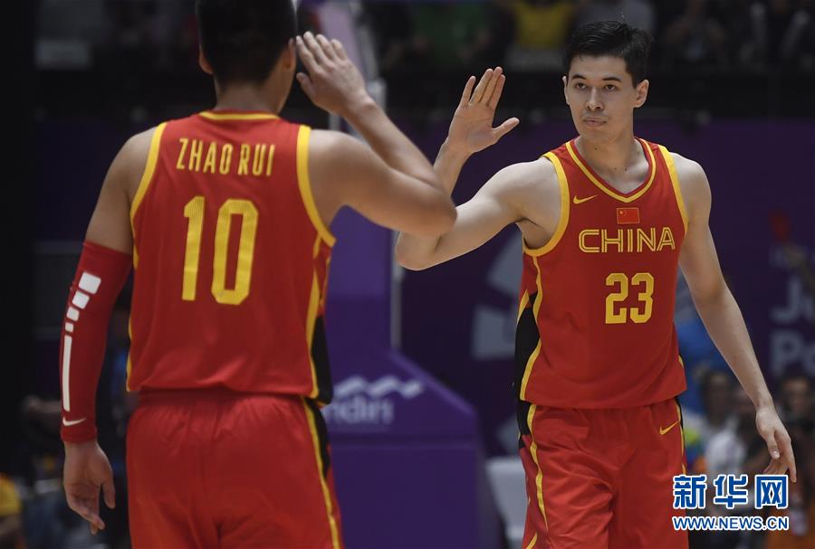 图为2018年9月1日,中国队球员阿不都沙拉木(右)和赵睿在第18届亚运会男子篮球决赛中的资料照片。 新华社记者黄宗治摄