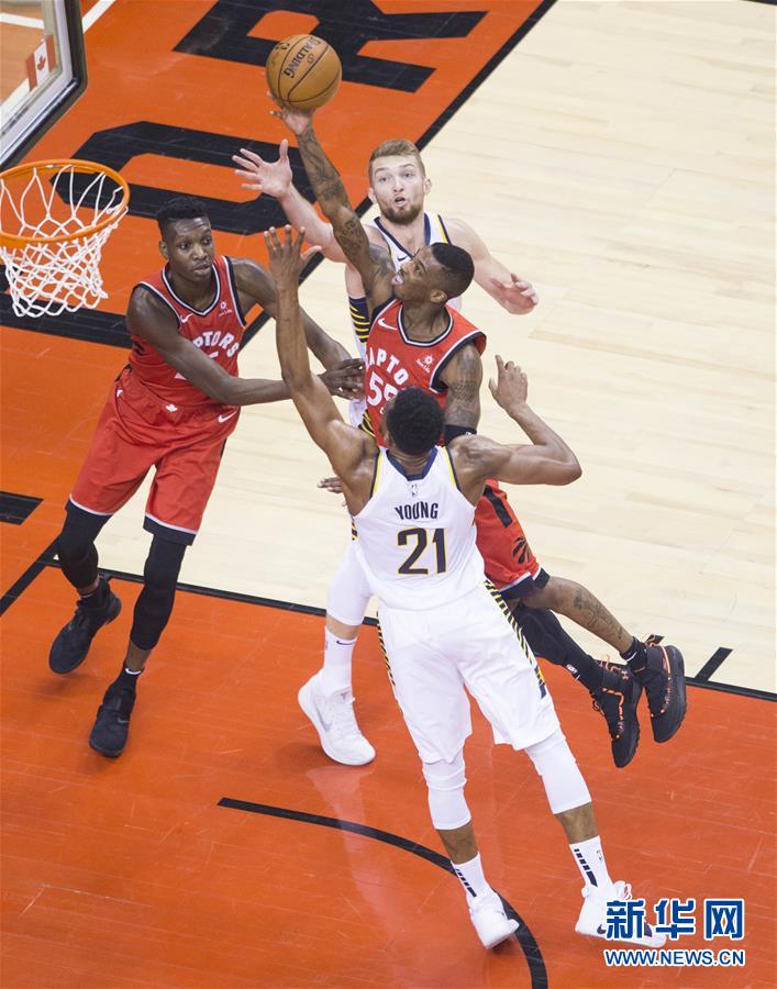 猛龙队球员德隆·怀特(右中)在比赛中上篮。 新华社发