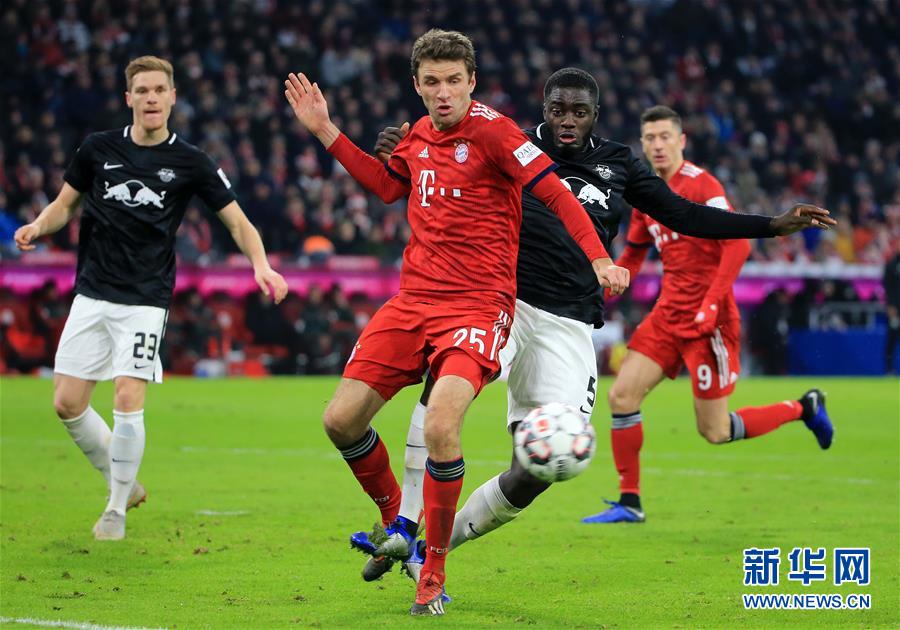 拜仁慕尼黑队球员穆勒(前左)与莱比锡队球员乌帕梅卡诺在比赛中拼抢。新华社发