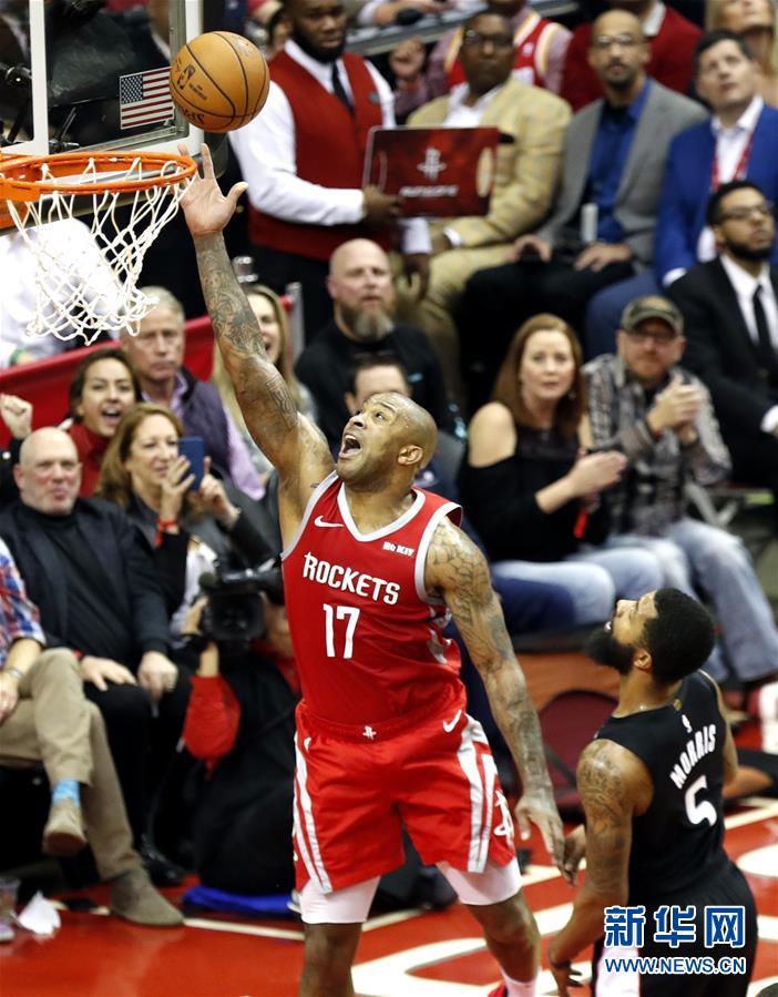 火箭队球员塔克(左)在比赛中上篮。 新华社发