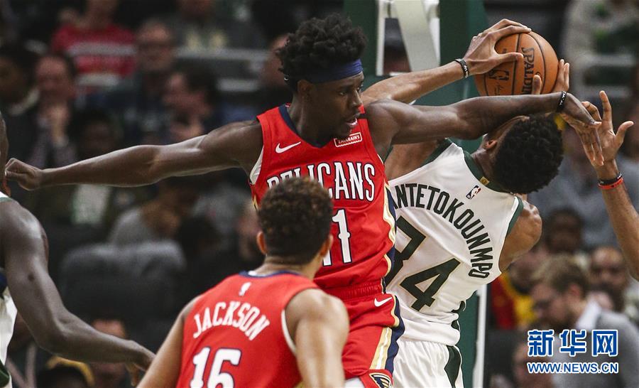 12月19日,鹈鹕队球员霍利迪(上左)在比赛中防守雄鹿队球员安特托昆博犯规。 当日,在2018-2019赛季NBA常规赛中,密尔沃基雄鹿队主场以123比115战胜新奥尔良鹈鹕队。 新华社发