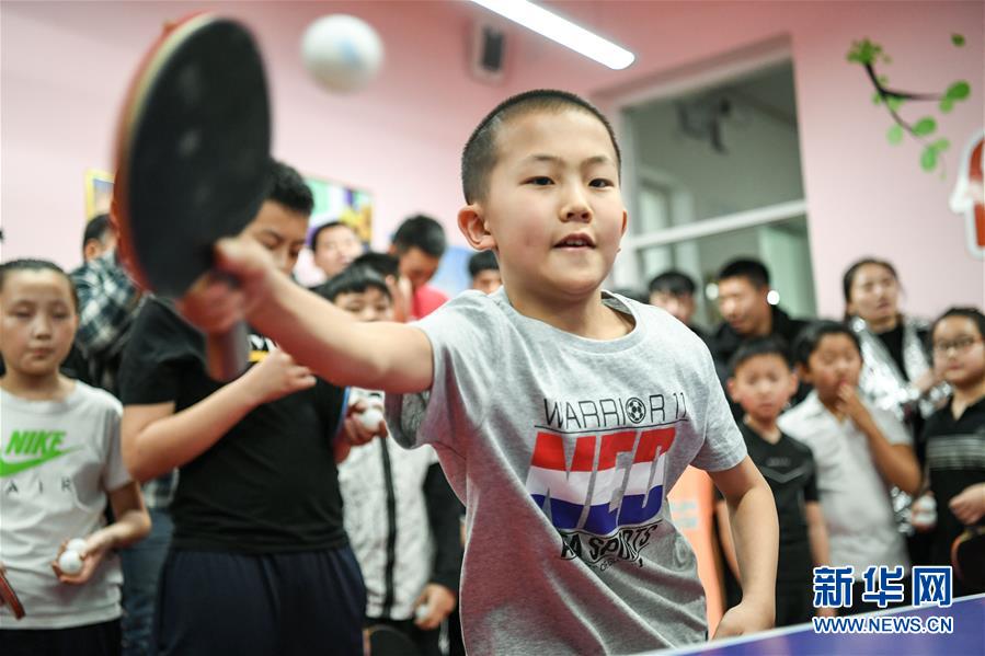 哈尔滨市公园小学校的学生与黑龙江中州电缆永刚俱乐部球员打乒乓球。 新华社记者王松摄