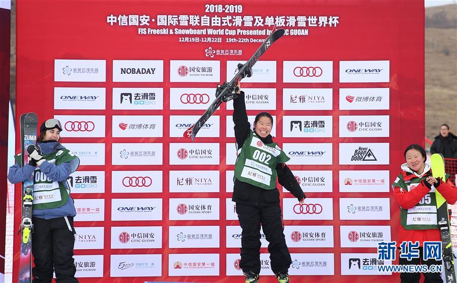 12月20日,张可欣(中)在颁奖仪式上庆祝。 当日,在2018-2019国际雪联自由式滑雪U型场地世界杯崇礼站女子组决赛中,中国选手张可欣以87.75分的成绩夺得冠军。 新华社记者曹灿摄