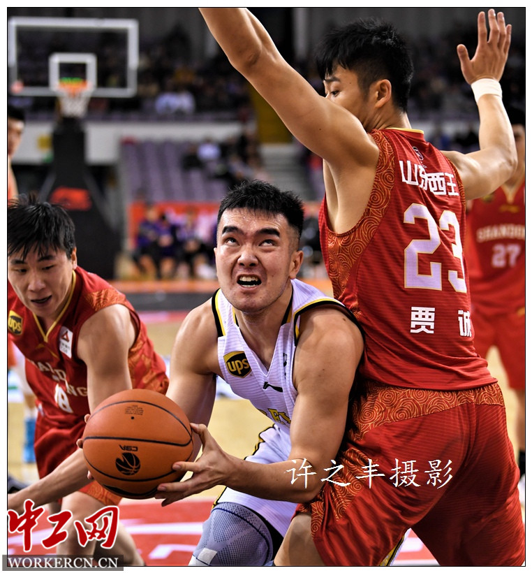 2018年12月22日晚,北京奥体中心篮球馆,CBA联赛第23轮比赛北京农商行队113比100战胜山东西王队,西王队遭遇六连败。图为双方比赛拼抢瞬间。工人日报-中工网记者许之丰摄影报道