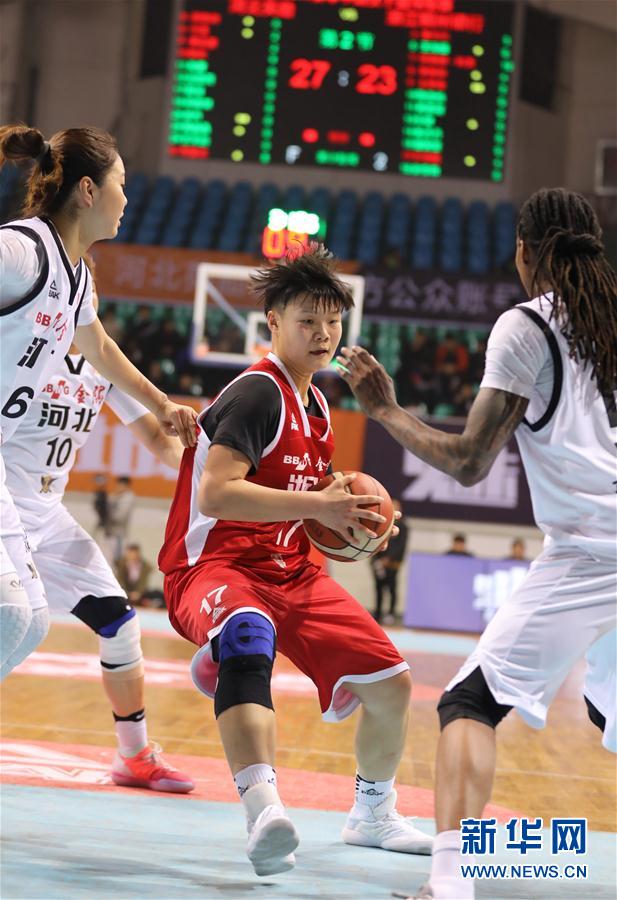 12月22日,浙江稠州银行队球员万济圆(中)在比赛中带球突破。 当日,在2018-2019赛季中国女子篮球联赛(WCBA)第24轮比赛中,河北英励队主场以77比56战胜浙江稠州银行队。 新华社记者朱旭东摄