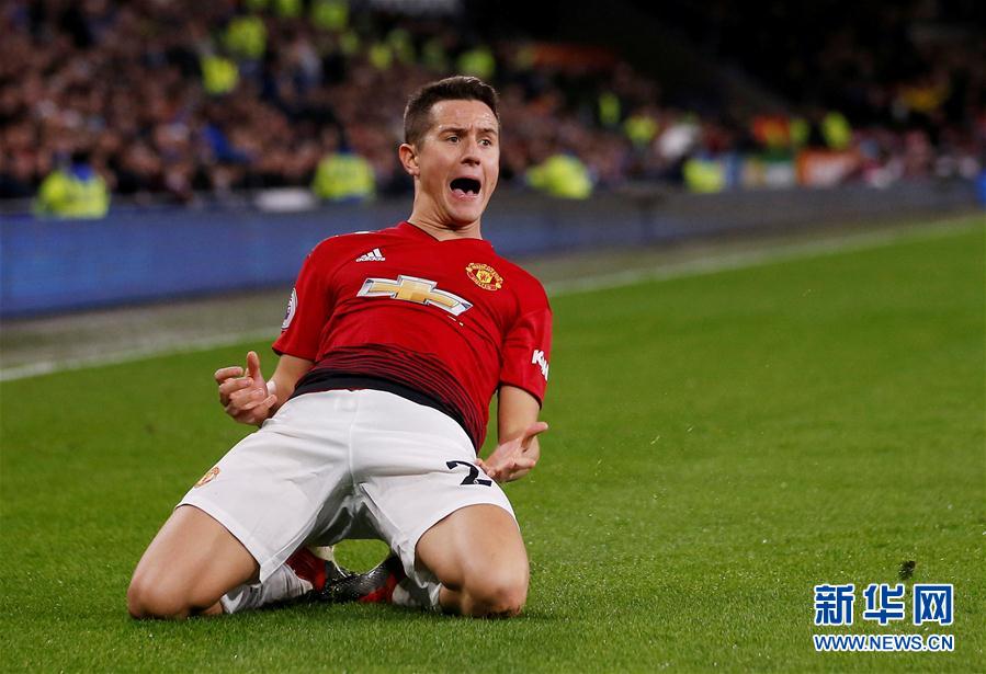 12月22日,曼联队球员埃雷拉在比赛中庆祝进球。 当日,在2018-2019赛季英超联赛第18轮比赛中,曼联队客场以5比1战胜卡迪夫城队。 新华社/路透