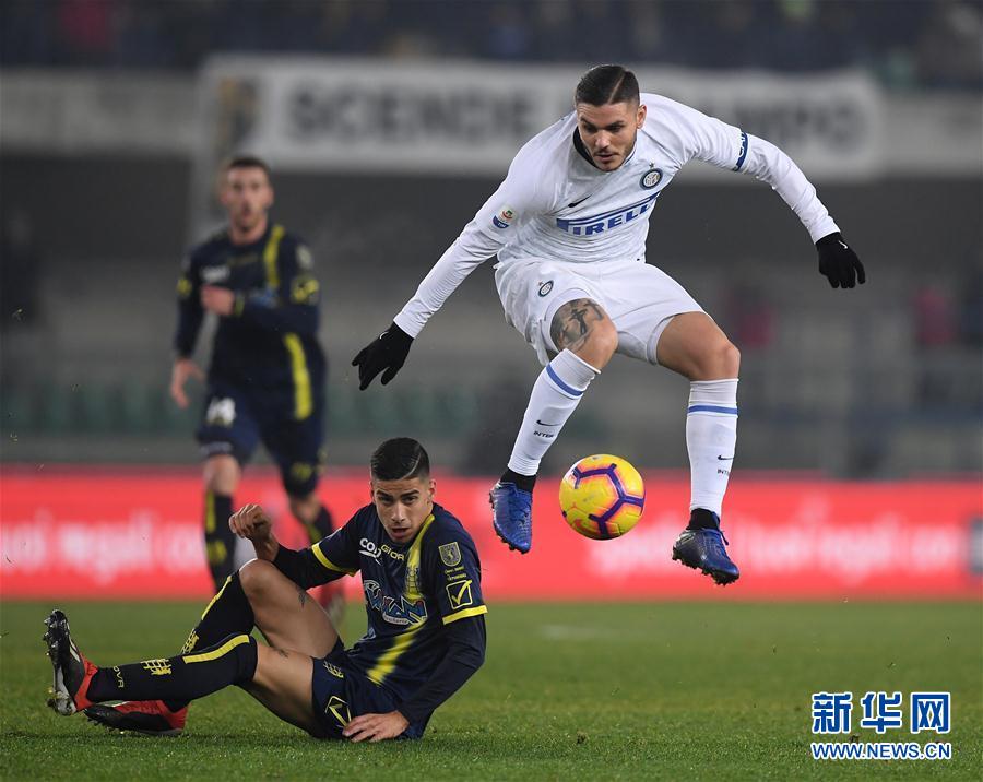 12月22日,国际米兰队球员伊卡尔迪(右)在比赛中与切沃队球员德保利拼抢。 当日,在2018-2019赛季意大利足球甲级联赛第17轮比赛中,切沃队主场以1比1战平国际米兰队。 新华社发(阿尔贝托·林格里亚摄)