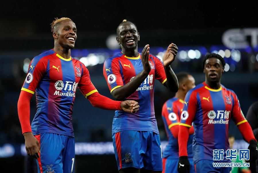 12月22日,水晶宫队球员扎哈(左一)和萨科(左二)在比赛后庆祝胜利。 当日,在2018-2019赛季英格兰足球超级联赛第18轮比赛中,曼城队主场以2比3不敌水晶宫队。 新华社/路透