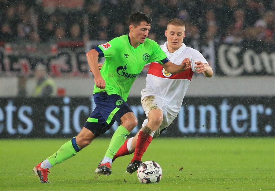 12月22日,沙尔克04队球员施霍夫(左)与斯图加特队球员阿斯卡齐巴尔拼抢。 当日,在2018-2019赛季德国足球甲级联赛第17轮比赛中,沙尔克04队客场以3比1战胜斯图加特队。 新华社发(菲利普·鲁伊兹摄)