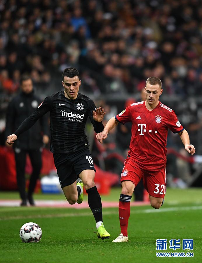12月22日,拜仁慕尼黑队球员基米希(右)与法兰克福队球员科斯蒂奇拼抢。 当日,在2018-2019赛季德国足球甲级联赛第17轮比赛中,拜仁慕尼黑队客场以3比0战胜法兰克福队。 新华社记者逯阳摄
