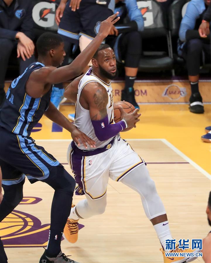 湖人队球员詹姆斯(右)在比赛中带球进攻。 新华社记者李颖摄