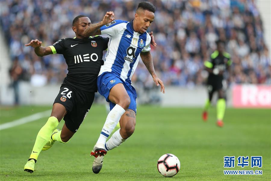 波尔图队球员米利唐(右)与里奥阿维队球员加布里尔在比赛中拼抢。 新华社发