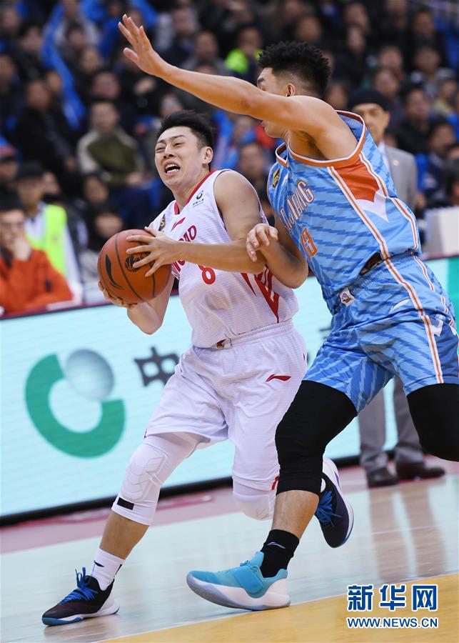 新疆广汇汽车队球员可兰白克·马坎(右)在比赛中防守青岛国信双星队球员周湛东。新华社记者李紫恒摄