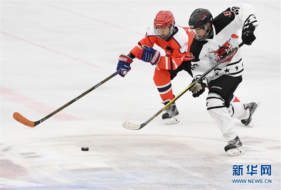 12月23日,东城区代表队队员段巽绗(右)在比赛中突破。 当日,北京市第一届冬季运动会竞技组冰球丙组决赛在石景山市民冰雪体育中心举行,东城区代表队男女混合丙组以1比0战胜朝阳区代表队男女混合丙组,获得冠军。 新华社记者张晨霖摄