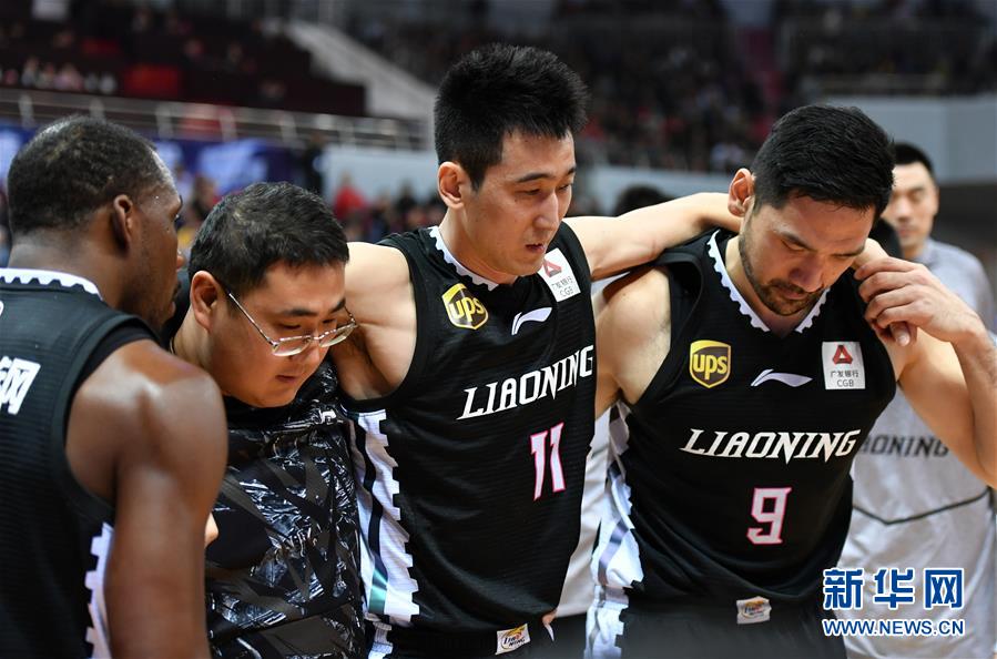 辽宁本钢队球员刘志轩(中)被搀扶下场。 新华社记者李然摄