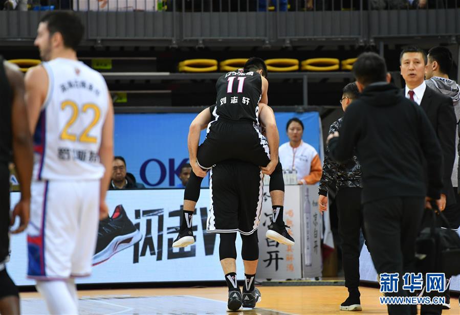 辽宁本钢队球员刘志轩被队友背下赛场。新华社记者李然摄