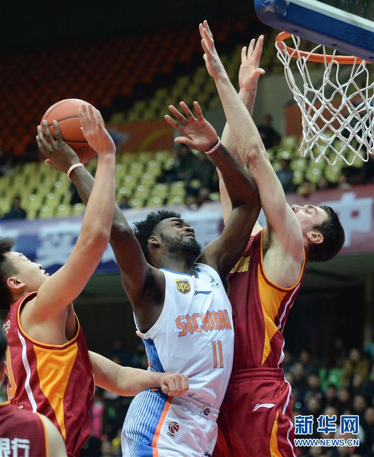 四川五粮金樽队球员富兰克林(中)在比赛中上篮。新华社发