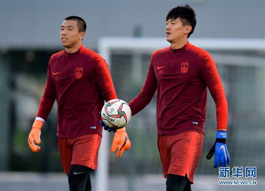 12月23日,中国队守门员颜骏凌(右)、郭全博在训练中。 当日,中国国家男子足球队继续在卡塔尔首都多哈的阿斯拜尔体育中心训练,备战2019年1月在阿联酋举办的亚洲杯。 新华社发(尼库摄)