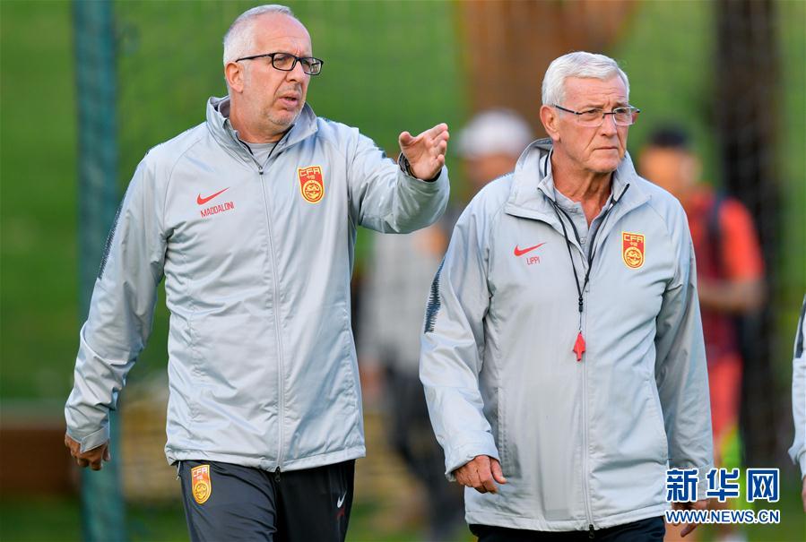 12月23日,中国队主教练里皮(右)、助理教练马达洛尼在训练中。 当日,中国国家男子足球队继续在卡塔尔首都多哈的阿斯拜尔体育中心训练,备战2019年1月在阿联酋举办的亚洲杯。 新华社发(尼库摄)