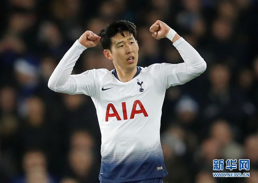 12月23日,热刺队球员孙兴民在比赛中庆祝进球。 当日,在2018-2019赛季英超联赛第18轮比赛中,热刺队客场以6比2战胜埃弗顿队。 新华社/路透
