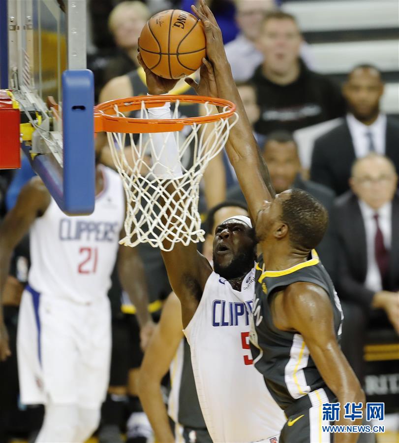 勇士队球员杜兰特(右)防守快船队球员哈雷尔的上篮。 新华社发
