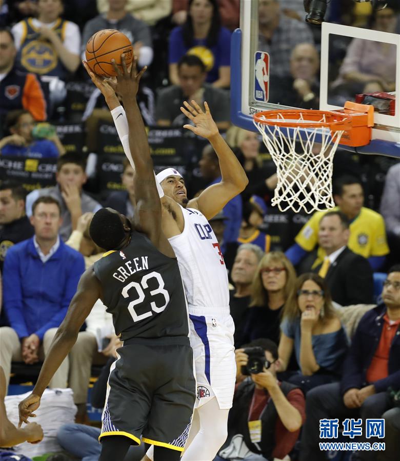 勇士队球员格林(左)防守快船队球员哈里斯的上篮。 新华社发