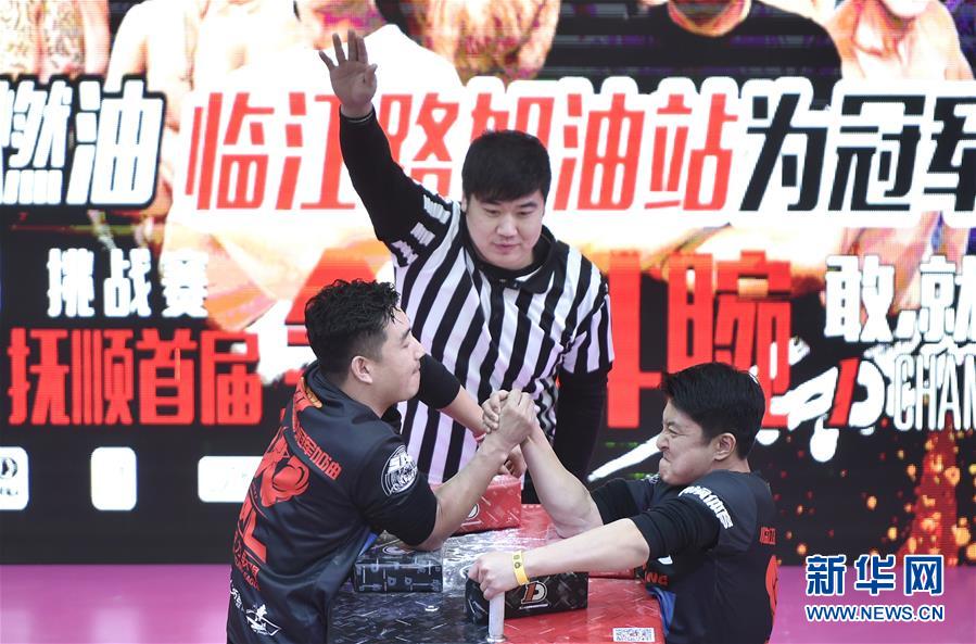 12月24日,两名选手在进行腕力比赛。 当日,在辽宁省抚顺市举行了一场腕力大赛,100多位“掰腕子”爱好者参赛。 新华社记者姚剑锋摄