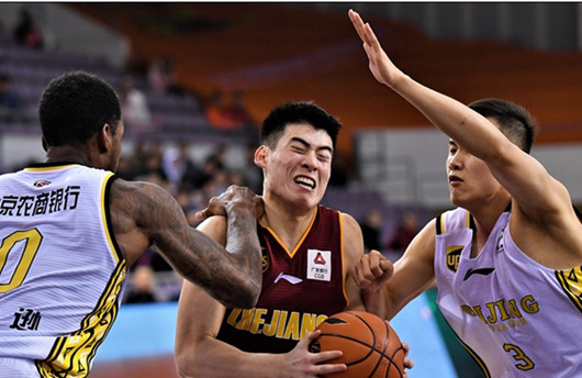 2018年12月25日晚,北京奥体中心篮球馆,CBA联赛第24轮比赛,北京农商行队主场95比84战胜浙江稠州银行队,农商行队迎来本赛季第一次两连胜,并送对手九连败。图为篮下双方的拼抢。工人日报-中工网记者许之丰摄影报道