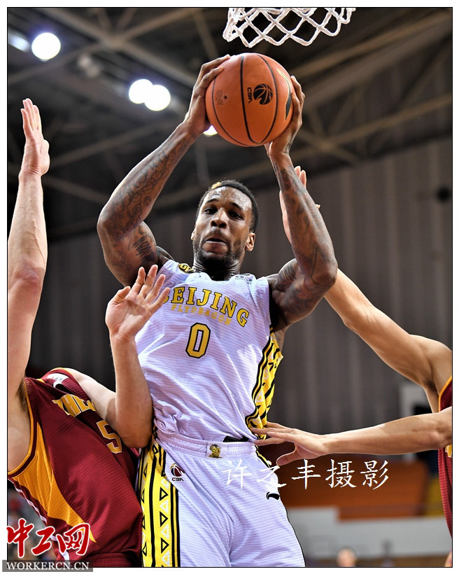 2018年12月25日晚,北京奥体中心篮球馆,CBA联赛第24轮比赛,北京农商行队主场95比84战胜浙江稠州银行队,农商行队迎来本赛季第一次两连胜,并送对手九连败。图为篮下双方的拼抢。工人日报-中工网记者许之丰摄影报道
