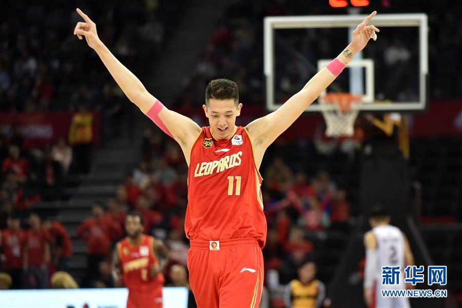 12月25日,深圳马可波罗队球员沈梓捷在球队得分后举起双臂庆祝。 当日,在2018-2019赛季中国男子篮球职业联赛(CBA)常规赛第24轮比赛中,时代中国广州队主场以113比121不敌深圳马可波罗队。 新华社记者梁旭摄
