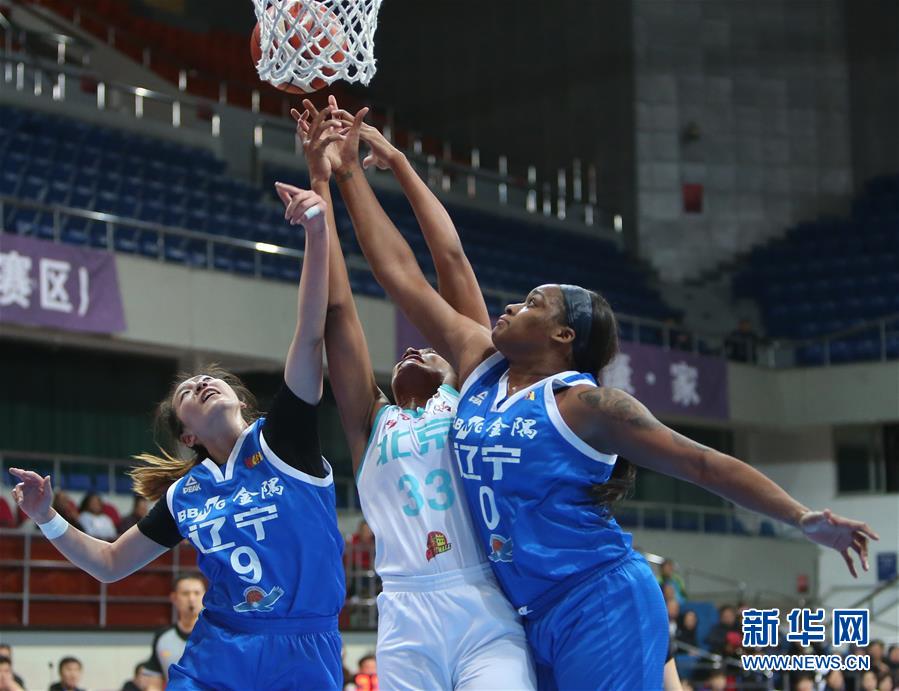 12月25日,北京首钢队球员摩根·塔克(中)与辽宁忠大铝业队球员邢金博(左)、拉索恩在比赛中拼抢篮板球。 当日,在2018-2019赛季中国女子篮球联赛(WCBA)第25轮比赛中,北京首钢队主场以70比66战胜辽宁忠大铝业队。 新华社发