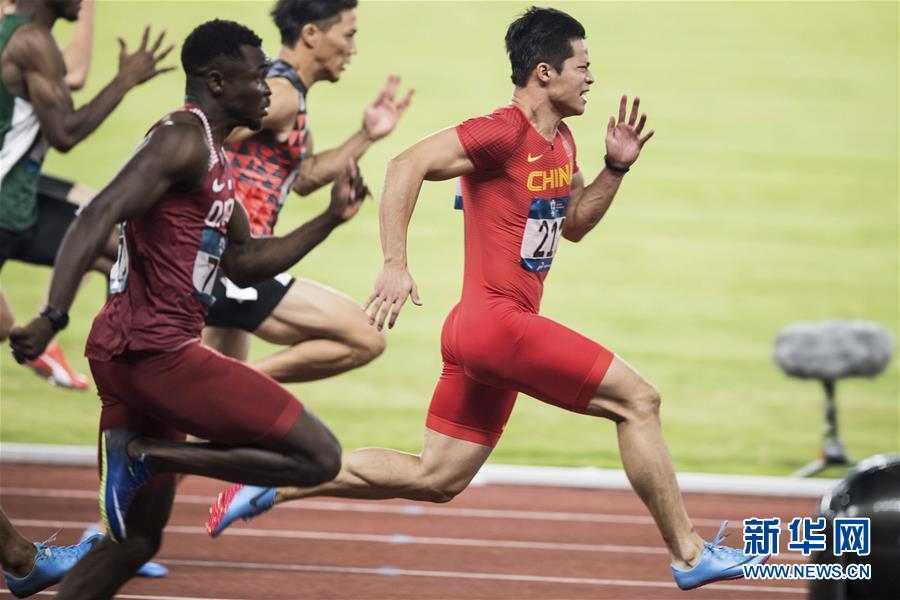 图为2018年8月26日,中国选手苏炳添(右)在第18届亚运会田径男子100米决赛中。苏炳添以9秒92的成绩获得冠军。 新华社记者 吴壮 摄