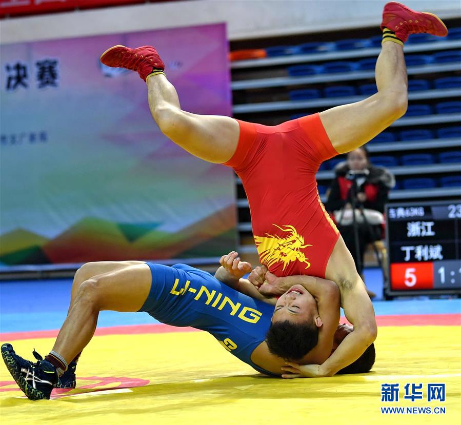 12月26日,浙江队选手丁利斌(上)在古典式摔跤63公斤级比赛中以8比3战胜四川队选手阿的阿克,夺得冠军。 当日,2018年全国男子自由式、女子自由式、古典式摔跤总决赛在河北迁安市闭幕。本次赛事为期三天,共有来自全国各地30支代表队的212名运动员参加了角逐。 新华社发(董钧摄)