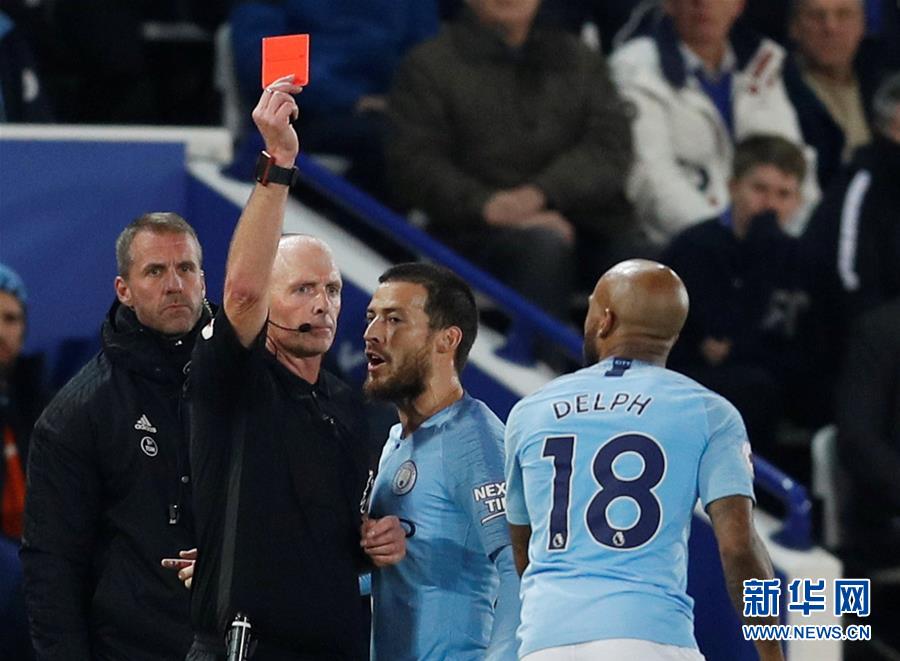 12月26日,曼城队球员德尔夫(右一)被主裁判出示红牌罚下。 新华社/路透