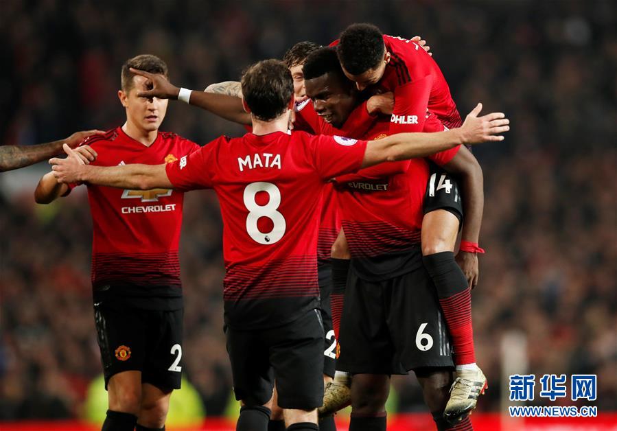 12月26日,曼联队球员博格巴(右二)进球后与队友庆祝。 当日,在2018-2019赛季英格兰足球超级联赛第19轮比赛中,曼彻斯特联队主场以3比1战胜哈德斯菲尔德队。 新华社/路透