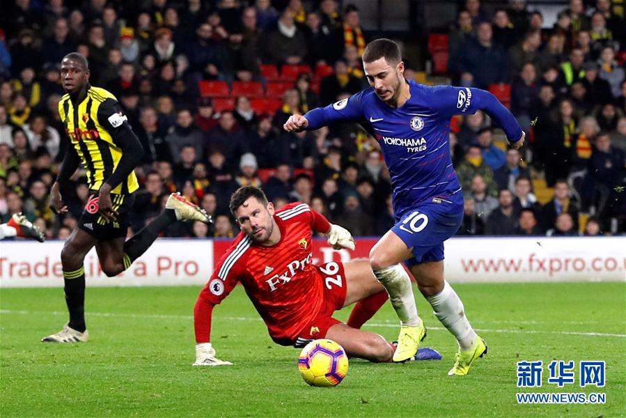 12月26日,切尔西队球员阿扎尔(右)在比赛中射门得分。 当日,在2018-2019赛季英格兰足球超级联赛第19轮比赛中,切尔西队客场以2比1战胜沃特福德队。 新华社/路透