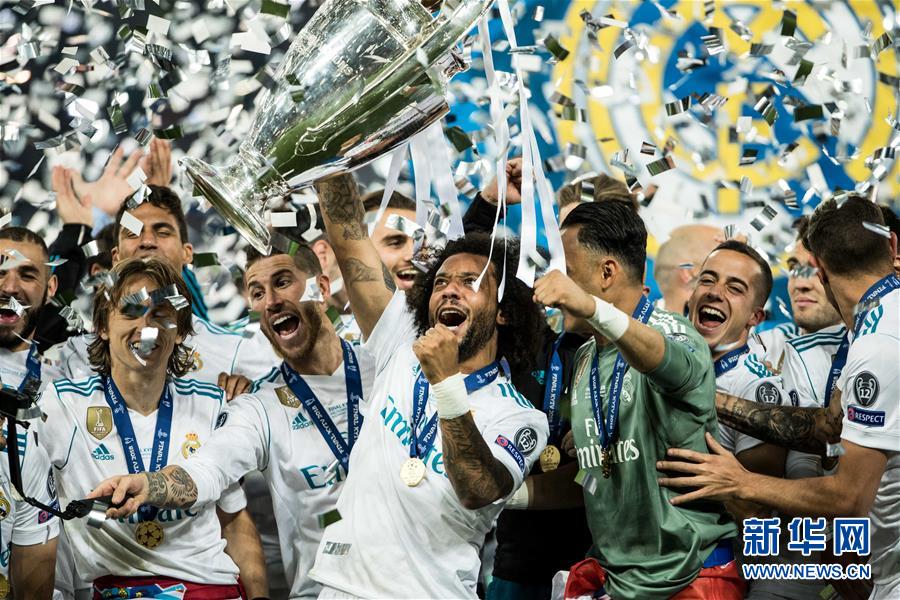 5月26日,皇家马德里队在欧冠决赛中3:1击败利物浦队,成为欧冠联赛改制以来首支三连冠球队。12月22日,皇马4:1战胜阿联酋球队艾因,创纪录地赢得世俱杯三连冠 图为2018年5月26日,皇家马德里队球员马塞洛(中)举起欧冠奖杯。当日,在乌克兰基辅举行的2017-2018赛季欧洲足球冠军联赛决赛中,皇家马德里队以3比1战胜利物浦队,夺得冠军。