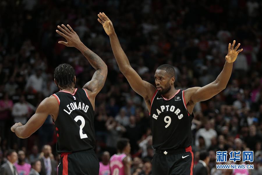 12月26日,猛龙队球员伊巴卡(右)与队友莱昂纳德在比赛中庆祝。 当日,在2018-2019赛季NBA常规赛中,多伦多猛龙队客场以106比104战胜迈阿密热火队。 新华社/美联