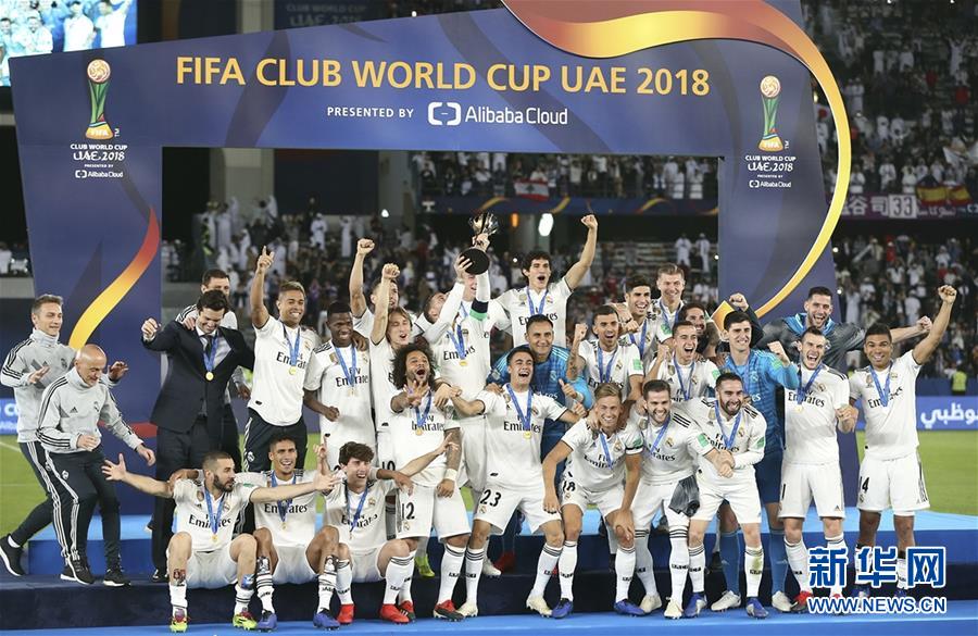 5月26日,皇家马德里队在欧冠决赛中3:1击败利物浦队,成为欧冠联赛改制以来首支三连冠球队。12月22日,皇马4:1战胜阿联酋球队艾因,创纪录地赢得世俱杯三连冠。 图为2018年12月22日,皇家马德里队在颁奖仪式上庆祝。当日,在阿联酋阿布扎比举行的2018年世俱杯决赛中,欧冠冠军皇家马德里队以4比1战胜东道主球队艾因,夺得冠军。 新华社发(穆罕默德·巴达尔丁摄)