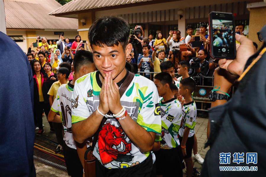 6月23日,泰国一支少年足球队12名11至16岁的男队员和1名男教练员在洞穴探险时遭遇洪水被困。7月10日,经过泰国、中国、美国、英国等多支国际救援队、上千名救援人员的努力,13人在受困18天后全部获救,创下了国际救援史上的奇迹。 图为2018年7月18日,在泰国清莱,从被困山洞中获救的少年足球队员准备参加新闻发布会。在新闻发布会上,足球队员们向所有救援人员致谢,并向在救援行动中牺牲的泰国海军前士兵默哀致歉。 新华社发