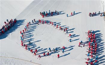 12月27日,学生们在进行滑雪前的热身运动(无人机拍摄)。 当日,内蒙古自治区乌兰察布市集宁区组织当地中小学生走出校园,到当地的大河湾国际滑雪场中体验冰雪运动的乐趣。 新华社记者彭源摄