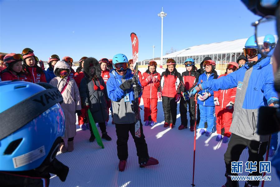 12月27日,滑雪教练孙启旺(中)为中小学生讲解如何使用雪具。新华社记者彭源摄