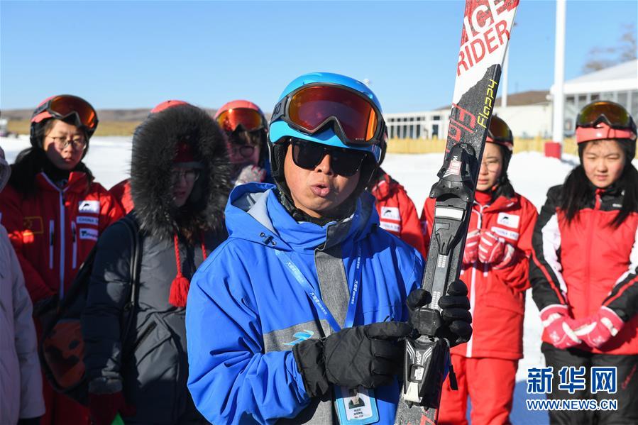 12月27日,滑雪教练孙启旺(中)为中小学生讲解如何使用雪具。新华社记者彭源摄