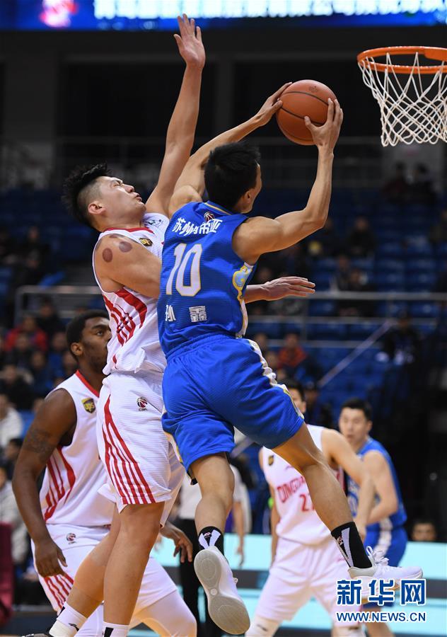 12月27日,青岛国信双星队球员王庆明(上左)在比赛中防守苏州肯帝亚队球员孙鑫(上右)上篮。 新华社记者李紫恒摄