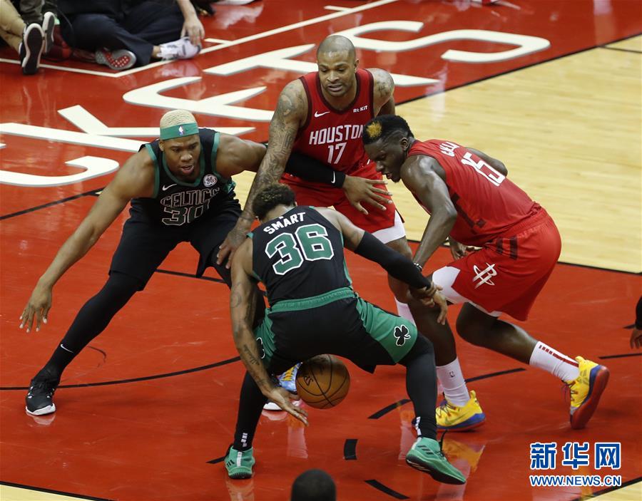 12月27日,火箭队球员卡佩拉(右一)和队友塔克(右二)在比赛中同凯尔特人队球员斯玛特(左二)拼抢。 当日,在2018-2019赛季NBA常规赛中,休斯敦火箭队主场以127比113战胜波士顿凯尔特人队。 新华社发 (宋穹摄)