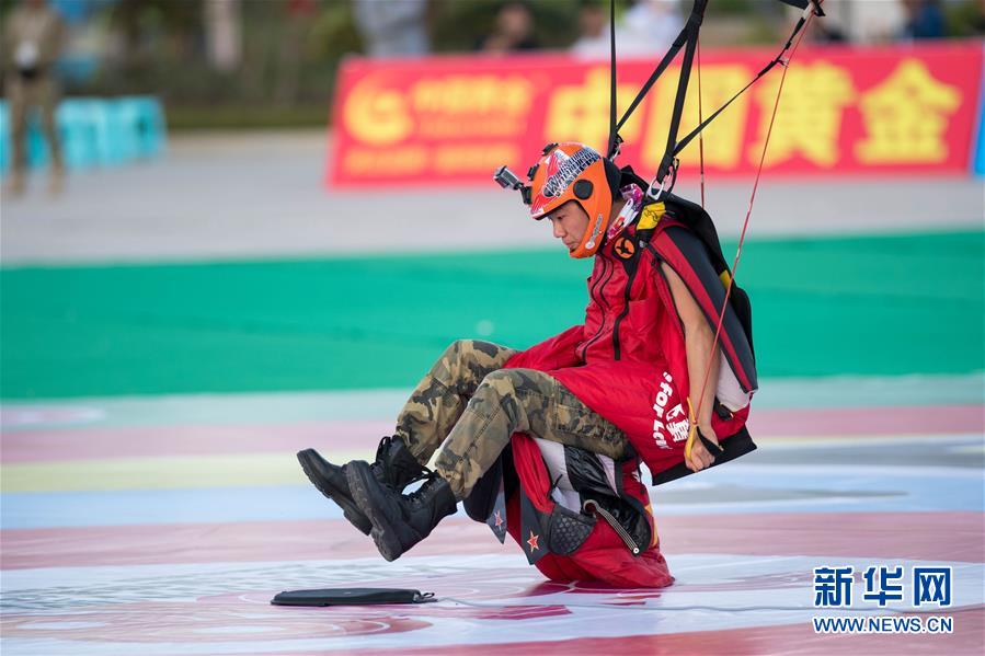 中国翼装飞行选手杨晟在团体定点着陆赛中着陆。 新华社记者胡超摄