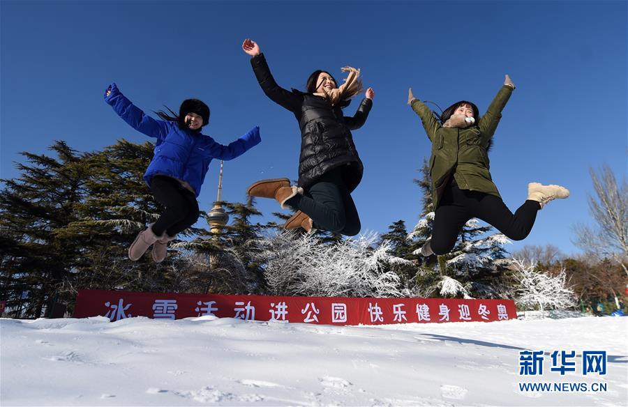 12月29日,三名女孩在雪地上跃起,让亲友拍照留念。 当日,以“玉渊冰雪季 健康迎冬奥”为主题的北京玉渊潭公园第十届冰雪季开幕。冰雪季包含雪上飞碟、雪地悠波球、雪地迷宫、冬奥知识长廊等多项健身休闲、趣味互动项目,让游客在体验雪上运动、休闲健身的同时,还能学习冬奥知识、感悟冬奥文化。 新华社记者李俊东摄
