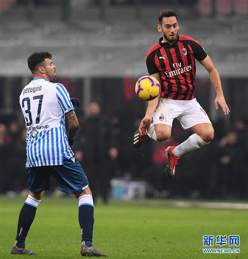 12月29日,AC米兰队球员恰尔汉奥卢(右)在比赛中与斯帕尔队球员佩塔尼亚拼抢。新华社发(阿尔贝托·林格里亚摄)