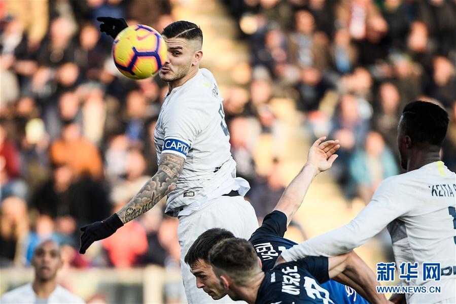 12月29日,国际米兰队球员伊卡尔迪(上)在比赛中争顶头球。 新华社/法新