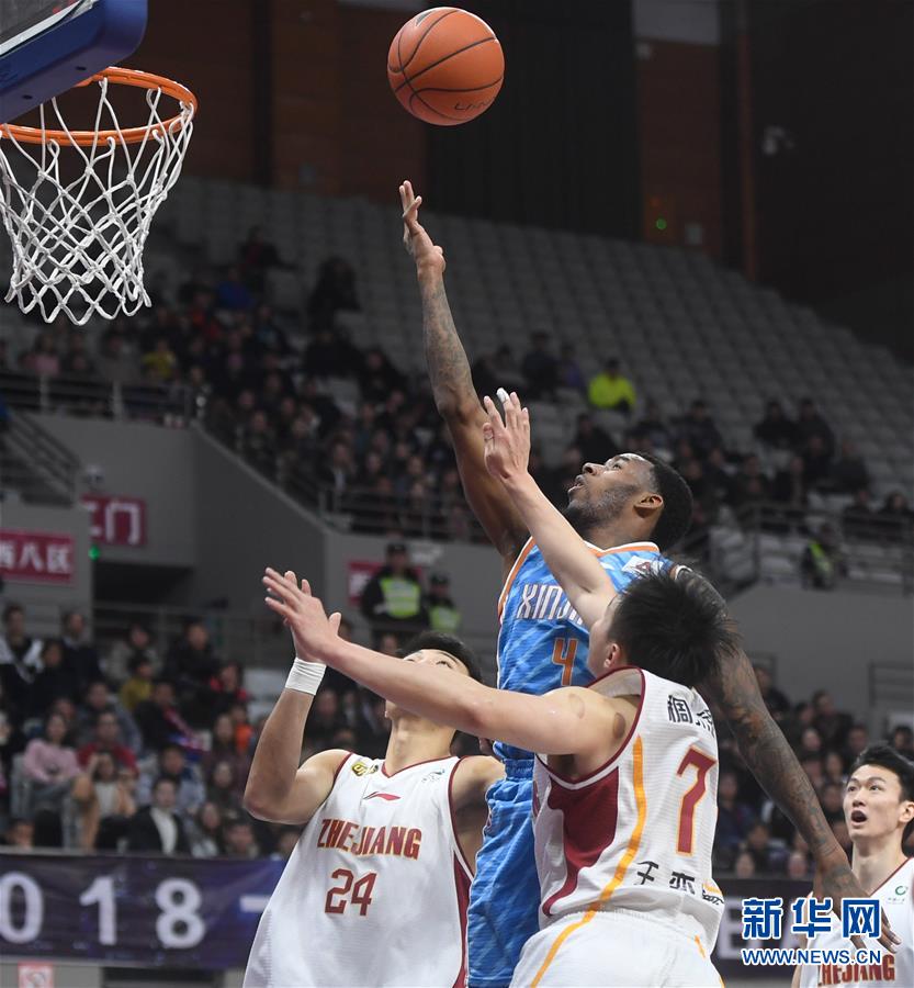 12月30日,新疆广汇汽车队球员亚当斯(上)在比赛中上篮。 当日,在2018-2019赛季中国男子篮球职业联赛(CBA)常规赛第26轮比赛中,浙江稠州银行队主场以111比105战胜新疆广汇汽车队。 新华社记者黄宗治摄